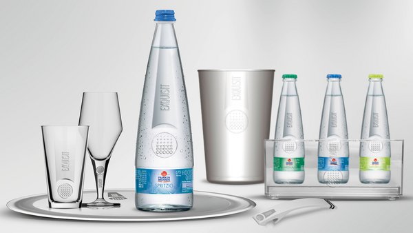 Das neue FRANKEN BRUNNEN EXQUISIT Sortiment wird neben exklusiven Gläsern auch von einem hochwertigen, neuen Werbemittelpaket begleitet. Hierfür wurden von der Designmanufaktur die wesentlichen Gestaltungselemente der Flasche aufgegriffen und widergespiegelt. Durch seinen unverwechselbaren Auftritt erfüllt das neue EXQUISIT Werbemittelsortiment – bestehend aus Flaschenkühlern, Tablett, Kapselheber, Tischaufstellern für das Gastronomie-Interieur, sowie individuellen und Dachmarkenwerbemitteln für den Außenbereich – damit ebenfalls höchste Ansprüche.